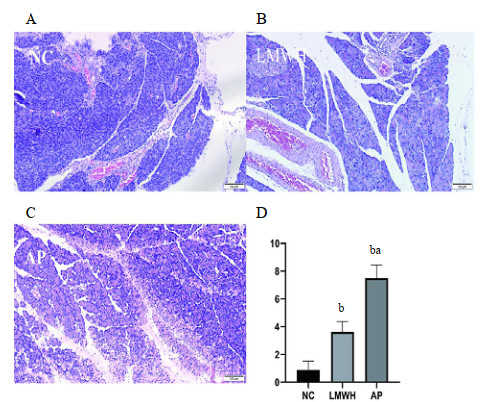 A: NC组胰腺组织无明显变化,病理评分较低; B: AP组胰腺组织见大量炎性细胞浸润,并可见少许灶性坏死,胰腺病理评分显著增高; C: LMWH干预后,胰腺病理损伤明显缓解,病理评分显著降低 图 3 三组大鼠胰腺HE染色结果 Fig 3 HE staining results of pancreas in three groups of rats |