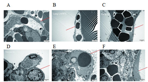 NC组(A, D)大鼠肺及胰腺组织在透视电镜下可见多糖包被结构致密、分布均匀,AP组(B, E)大鼠多糖包被结构几乎完全中断;经LMWH干预后(C, F)多糖包被结构损伤明显减轻,连续性较好(红线标记处为多糖包被结构) 图 4 大鼠肺及胰腺组织透视电镜结果 Fig 4 Fluoroscopic electron microscopic results of lung and pancreas in rats |