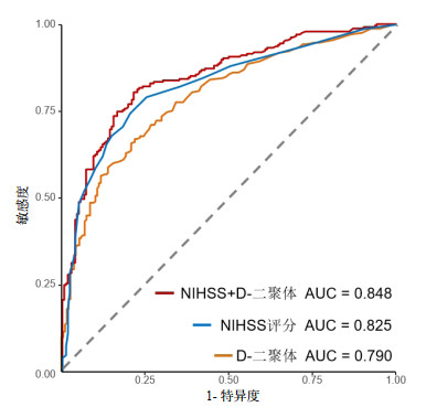 受试者工作特征曲线提示基线NIHSS评分[AUC: 0.83 (0.79~0.87)]和D-二聚体值[AUC 0.79(0.74~0.83)]对大血管闭塞有较好预测价值, 曲线下面积分别为0.83和0.79。采用多因素logistic回归模型对NIHSS评分和D-二聚体值联合建模,评估NIHSS评分联合D-二聚体对大血管闭塞的预测效果,构建风险模型:logit(P)= -1.6345 + 0.1672*NIHSS评分+ 0.5895*D-二聚体,模型的受试者工作特征曲线下面积为0.85(0.81~0.89)。(图 2)约登指数分析提示NIHSS评分 > 6.5分是预测大血管闭塞的临界值(敏感度74.4%,特异度79.8%),D-二聚体 > 0.57 mg/L是预测大血管闭塞的临界值(敏感度66.2%,特异度78.1%)。