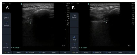 A:吸气末膈肌厚度;B:呼气末膈肌厚度 图 2 膈肌厚度 Fig 2 Diaphragm thickness |