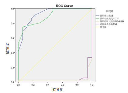 临床上40%的危重症患者需要机械通气,而脱机失败与高病死率和不利因素如误吸、肺不张、肺炎等明显相关[18]。因此,机械通气患者脱机前临床医生需评估呼吸功能状态,越来越多研究表明膈肌弱化在接受机械通气的患者中普遍存在,并且已证实是脱机失败的一个重要因素[19-20],当患者进行机械通气时,膈肌功能障碍会随通气时间的推移而增加[21-22]。因此,寻找一种单一的预测因子,临床易操作,且能提供膈肌功能的实时图像,对于评估脱机时机显得尤为重要。膈肌超声是一种非侵入性的、操作简单且具有较高的重现性等许多优点,其膈肌移动度(DE)和膈肌厚度变化率(DTF)反映膈肌功能指标被证实可以用来预测机械通气患者脱机的可靠指标[23],这于国内研究者程滔等[15]研究结论相符。常规脱机指标中,RSBI是目前关注度较高的可以预测成功脱机参考标准,但其准确性和个体差异饱受争议。由于RSBI预测指标不评估膈肌的功能状态,故膈肌功能障碍常常被遗漏,这增加了再次气管插管的可能性。本项研究发现DE、DTF、D-RSBI都可以反映患者膈肌功能状态,可作为脱机成功的预测因子,D-RSBI与RSBI评估脱机效能相当,且特异度略优于RSBI,对比程滔等[15]在评估指标上有所创新。研究[24]发现D-RSBI因超声优势可广泛应用于临床,患者依从性高,在准确性和客观性方面要优于RSBI。研究[25]发现D-RSBI在预测成功撤机准确度方面优于传统评估指标RSBI,这与Hoskawa等[24]研究相符。