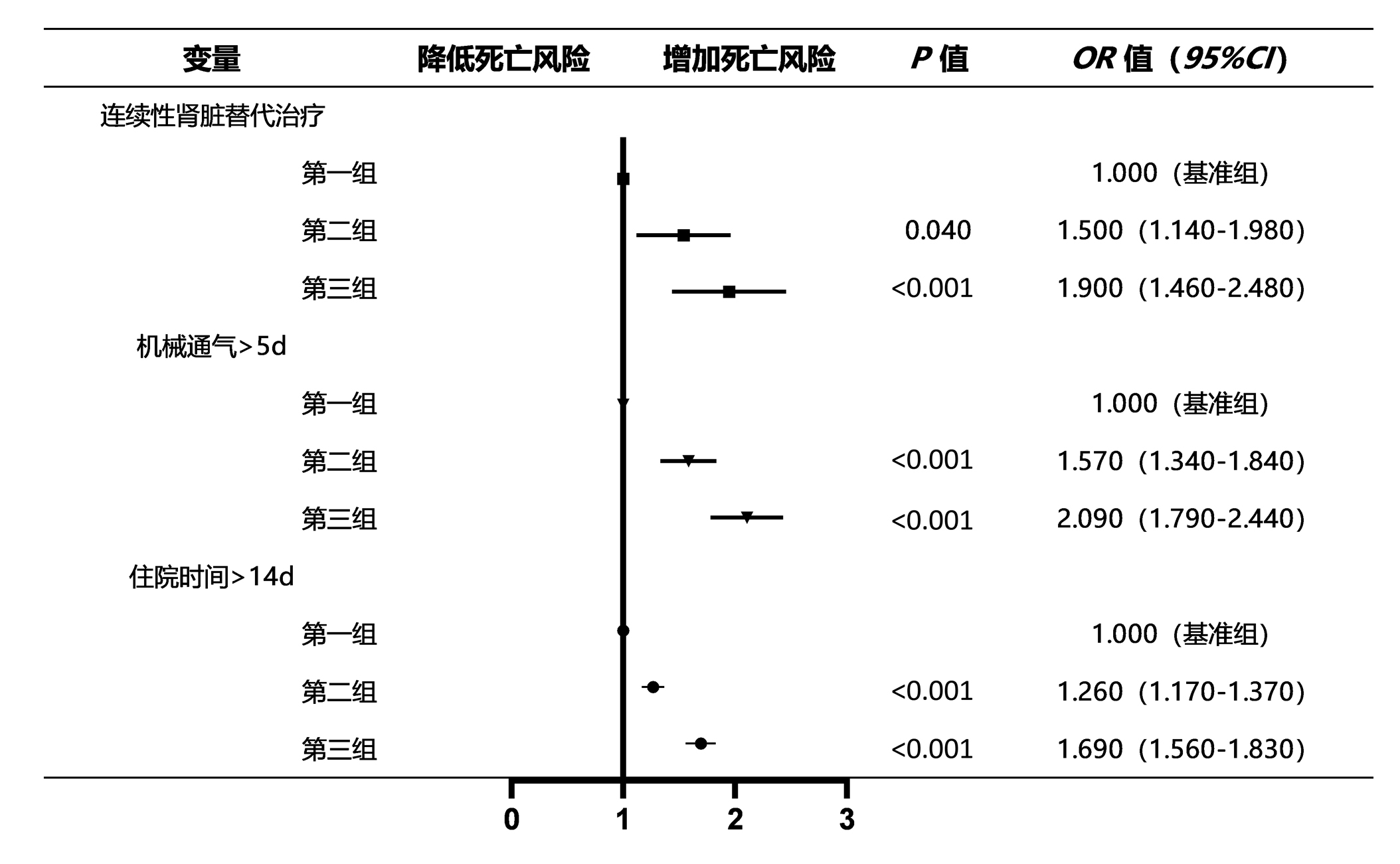 | 点估计代表OR,误差线代表 95%CI;校正混杂因素:年龄、性别、并发症、生命体征、疾病严重程度评分 图 1 单因素分析SII与次要结局指标关系(校正混杂因素) Fig 1 Univariate analysis of secondary outcomes (adjusted OR) |