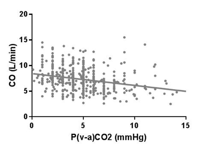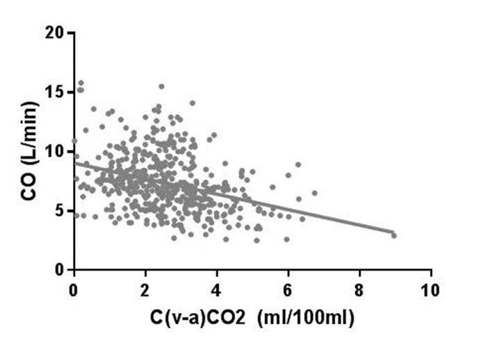 | Spearman r = -0.34, 95%CI -0.42 ~ -0.25. P < 0.0001. Equation: Y = -0.65*X+9.03. CO :心输出量。C(v-a)CO2 :混合静脉 - 动脉 CO2 含量差 图 1 104例患者的476对CO与C(v-a)CO2的相关性分析 Fig 1 Correlation analysis of 476 pairs of CO and C(v-a)CO2 in 104 patients |