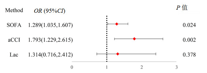 低aCCI评分组比高aCCI评分组发生脓毒性休克的比例低(30.0% vs. 71.0%,χ2=10.238,P<0.05)。Logistic回归分析提示老年脓毒症患者早期乳酸(OR=1.314;95% CI:0.716~2.412;P > 0.05)不是提示脓毒性休克的危险因素;高aCCI评分(OR=1.793;95% CI:1.229~2.615;P<0.01)老年脓毒症患者比高SOFA评分(OR=1.289;95% CI:1.035~1.607;P<0.05)的患者发生脓毒性休克的风险更大(图 1)。