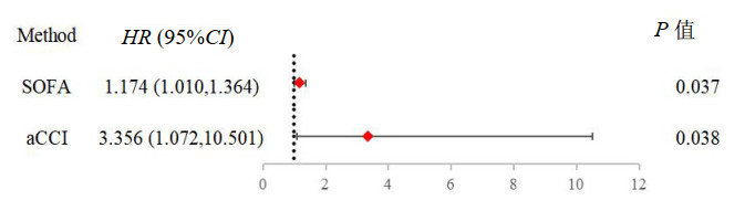 低aCCI评分组存活率显著高于高aCCI评分组(73.3% vs. 38.7%,χ2=7.408,P<0.05)。多因素Logistic回归分析提示SOFA评分(OR=1.174;95% CI:1.010~1.364;P<0.05)和aCCI评分(OR=3.356;95% CI:1.072~10.501;P<0.05)都是影响28 d生存的独立影响因素(图 2)。