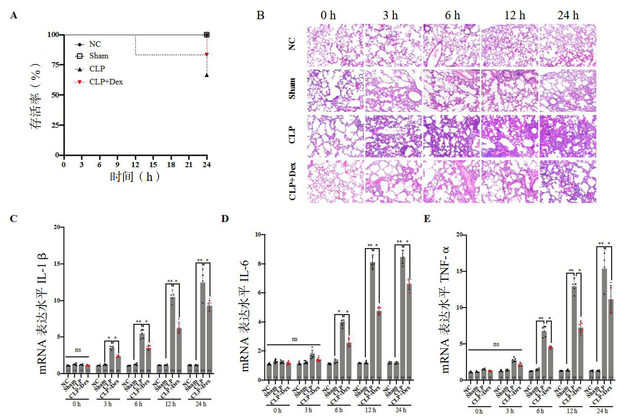 1.2 脓毒症小鼠模型的建立采用盲肠结扎穿孔法(cecal ligation and puncture,CLP)诱导小鼠脓毒症,通过动物生存、术后小鼠载菌量、血常规和血生化指标、细胞因子水平、组织病理变化等方面对模型进行综合的评估。本研究采用SPF级别雌性ICR小鼠,8~10周龄,小鼠体重为23~27 g,共24只,动物饲养室:中日友好医院动物室,小鼠实验获得中日友好医院动物伦理委员会批准,批准号为:zryhyy21-22-09-01。开展动物实验前,均术前适应性饲养1周,以便使其适应饲养室环境,术前12 h禁食,采用合格小鼠入组。小鼠从笼中取出后,暴露腹部,右下腹腔注射4%水合氯醛(0.1 mL/10 g)将小鼠麻醉。CLP组小鼠待麻醉成功后,进行消毒处理,沿腹中线切开腹膜,暴露盲肠,用丝线在回盲肠联合部结扎盲肠,18号针头对盲肠穿孔,然后将盲肠放回腹腔,依次缝合。阴性对照组,即Sham组小鼠异氟烷吸入麻醉后,沿腹中线切开腹膜,暴露盲肠,取出后重新放回腹腔,缝合。缝合后小鼠均保温和正常饲养。CLP+Dex组小鼠麻醉前15 min腹腔注射DEX (50 μg/kg),Sham组和CLP组小鼠在麻醉前15 min腹腔注射1 mL无菌生理盐水。记录术后24 h内各组小鼠的存活率。在CLP术后0、3、6、12、24 h时行处死实验小鼠,收集小鼠肺脏。