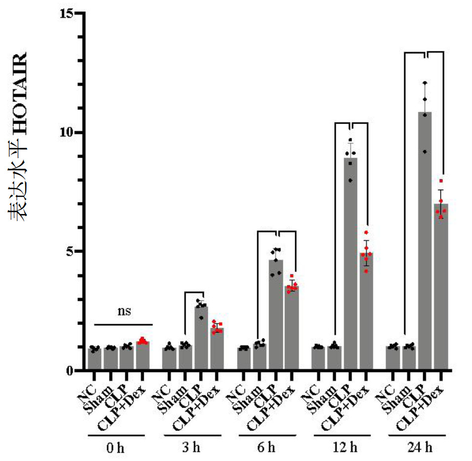 2.3 Dex治疗显著下调脓毒症小鼠肺脏的lncRNA-HOTAIR表达水平分析小鼠肺部组织中lncRNA-HOTAIR的水平变化,结果如图 2所示:CLP组中肺组织lncRNA-HOTAIR水平较假手术组具有显著提高,分别在CLP术后3、6、12和24 h升高1.6、3.6、7.8、9.8倍。在CLP+Dex组中,结果显示经Dex治疗后,降低了肺组织中lncRNA-HOTAIR表达水平,其中在Dex治疗6~24 h后,HOTAIR表达水平分别下降1.1倍(P < 0.05)、4.0倍(P < 0.01)和3.8倍(P < 0.01)。