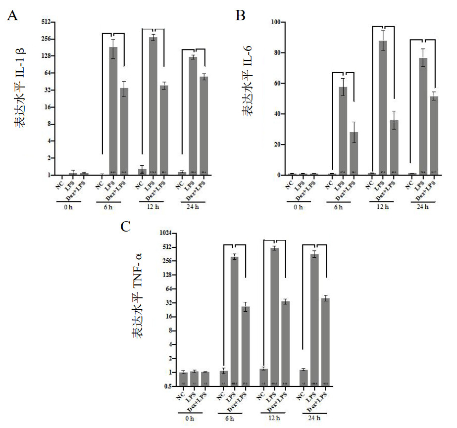 首先,在RAW 264.7细胞建立了研究脓毒症的细胞模型。即以1 μmol/L Dex进行预处理RAW 264.7细胞,12 h后,加入100 ng/mL LPS至RAW 264.7培养基中,继续培养24 h。在LPS处理的6 h、12 h和24 h,收取细胞样品用于细胞因子检测。结果如图 3所示:相较于空白组,LPS处理RAW264.7细胞后IL-1β、IL-6和TNF-α mRNA水平均呈显著性升高(P < 0.01)。其中IL-1β和IL-6在LPS处理12 h后达到最高水平;TNF-α水平在LPS处理24 h达到最高。经Dex干预后,LPS刺激产生的IL-1β、IL-6和TNF-α水平均呈下调。其中,在Dex干预24~36 h(即LPS处理12~24 h)后RAW264.7细胞中的IL-1β、IL-6和TNF-α水平的相较于Dex未干预组均呈显著性下调(P < 0.01)。结果表明,在RAW264.7细胞上成功建立了研究Dex改善脓毒症小鼠肺损伤的体外研究模型。