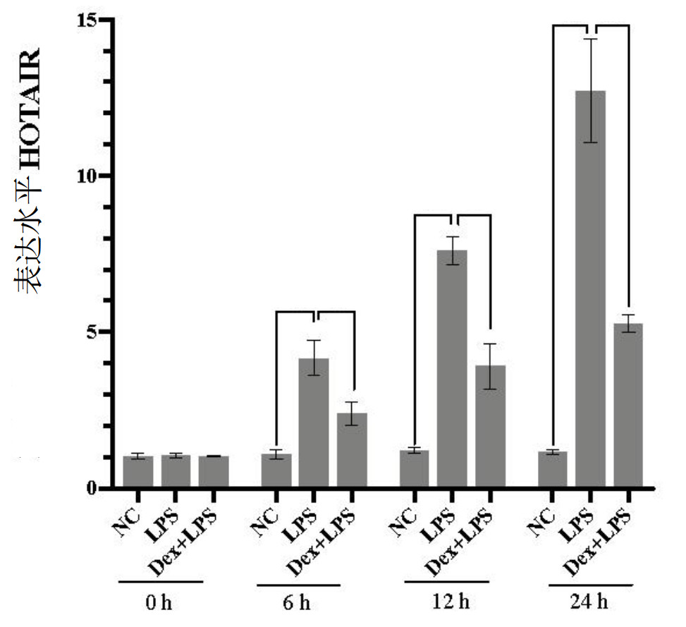 与PBS对照组(PBS)相比,LPS处理组可以显著上调lncRNA-HOTAIR的水平,在24 h达到最大,为空白组的11.5倍(P < 0.01)(图 4)。此外,在Dex干预24~36 h(即LPS处理12~24 h)后RAW264.7细胞中的lncRNA-HOTAIR水平的相较于Dex未干预组均呈显著性下调。其中,在Dex干预24 h或者36 h时,相较于Dex未干预组,lncRNA-HOTAIR水平分别下调2.7倍(P < 0.05)和6.4倍(P < 0.01)。