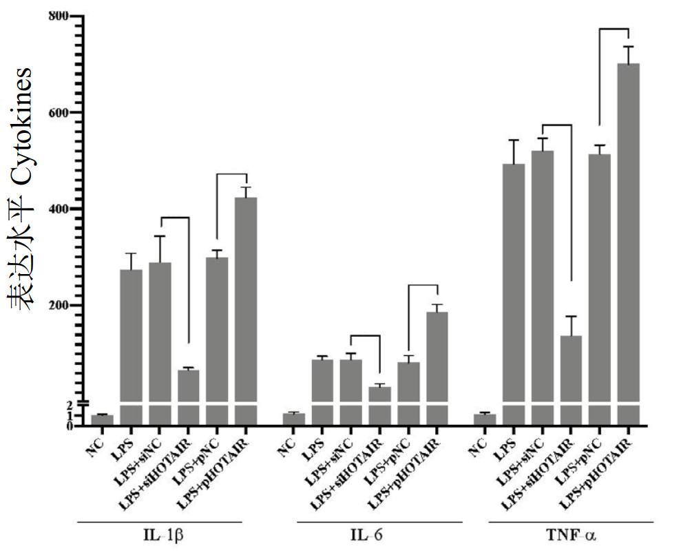 本研究用转染40 nmol/L siRNA-HOTAIR方式在RAW264.7细胞上进行敲低HOTAIR;用转染2 mg plncRNA-HOTAIR方式在RAW264.7细胞上进行过表达HOTAIR。同时,转染40 nmol/L siRNA-NC和2 mg pNC作为阴性对照。转染48 h后,用LPS处理12 h后,弃掉培养基,PBS润洗3遍后,收集细胞样品,提取其RNA,并进行细胞因子分析。上述所用lncRNA-HOTAIR干扰RNA或过表达质粒及其对照均购自上海吉玛公司。
