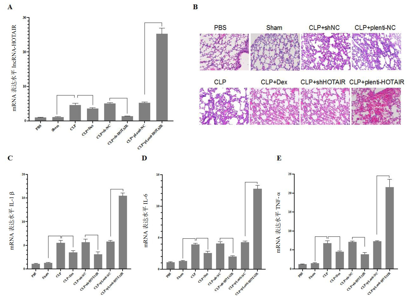 1.6 体内敲低或过表达lncRNA-HOTAIR以GenBank中NR_047528序列基础构建过表达lncRNA-HOTAIR(pLenti-HOTAIR)或者敲低lncRNA-HOTAIR(pLenti-shHOTAIR)慢病毒骨架质粒及其空载对照质粒,然后生产和纯化该慢病毒悬液,由上海吉玛公司完成。最终获取的慢病毒悬液滴度为1×109 TU/mL,在CLP手术前24 h,每只小鼠通过腹腔注射100 μL慢病毒悬液完成HOTAIR预处理,CLP手术后6 h,所有小鼠全部处死,收集小鼠肺脏。