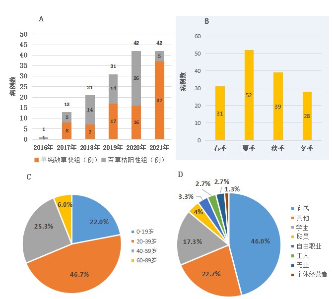 A 为中毒者年份分布;B 为中毒季节分布;C 为中毒者年龄分布;D 为中毒者职业分布 图 1 中毒总体特征分布 |