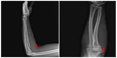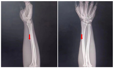 1 资料与方法患者男性,17岁,因“左前臂异物8 h”于2022-05-23 21:25收住急诊抢救室。患者8 h前修车时敲打金属物品,小片金属飞溅至左前臂,伴少量出血,无麻木等不适主诉。后立即于当地医院就诊,X线示异物位置如图 1,当地医院建议转上级医院。上级医院再次行X线检查(图 2),后予以臂丛麻醉下行“左上肢清创+异物取出术”术中未见异物,术后复查X线,左上肢,左肩部以及左侧胸部未见异物,嘱立即转至本院。
