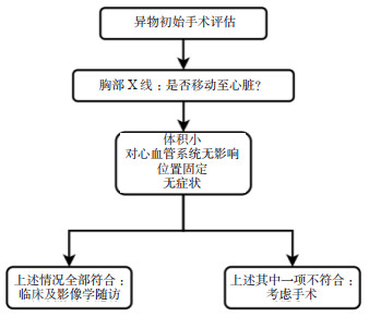 2.3 治疗目前,心脏异物的诊治仍无标准化指南。在异物迁移到心脏的情况下,已经提出了几种治疗方法。如患者无不适主诉,可进行临床及X线随访[15, 20-23]。如患者有不适症状或异物直接威胁到心血管完整性,则行手术移除。手术方式包括胸廓切开术或胸骨切开术,伴或不伴体外循环[24-30]。Legras等[31]提出心脏异物的诊疗思路(图 5)。部分患者对心脏异物的存在感到焦虑,这也是手术的绝对指征[32-34]。Symbas等[8]认为腔内或部分嵌入心肌的异物,特别是左侧心腔,因感染或栓塞的风险而应移除。一些医源性的异物因涉及医疗法律纠纷,有时会影响手术或保守治疗的选择。