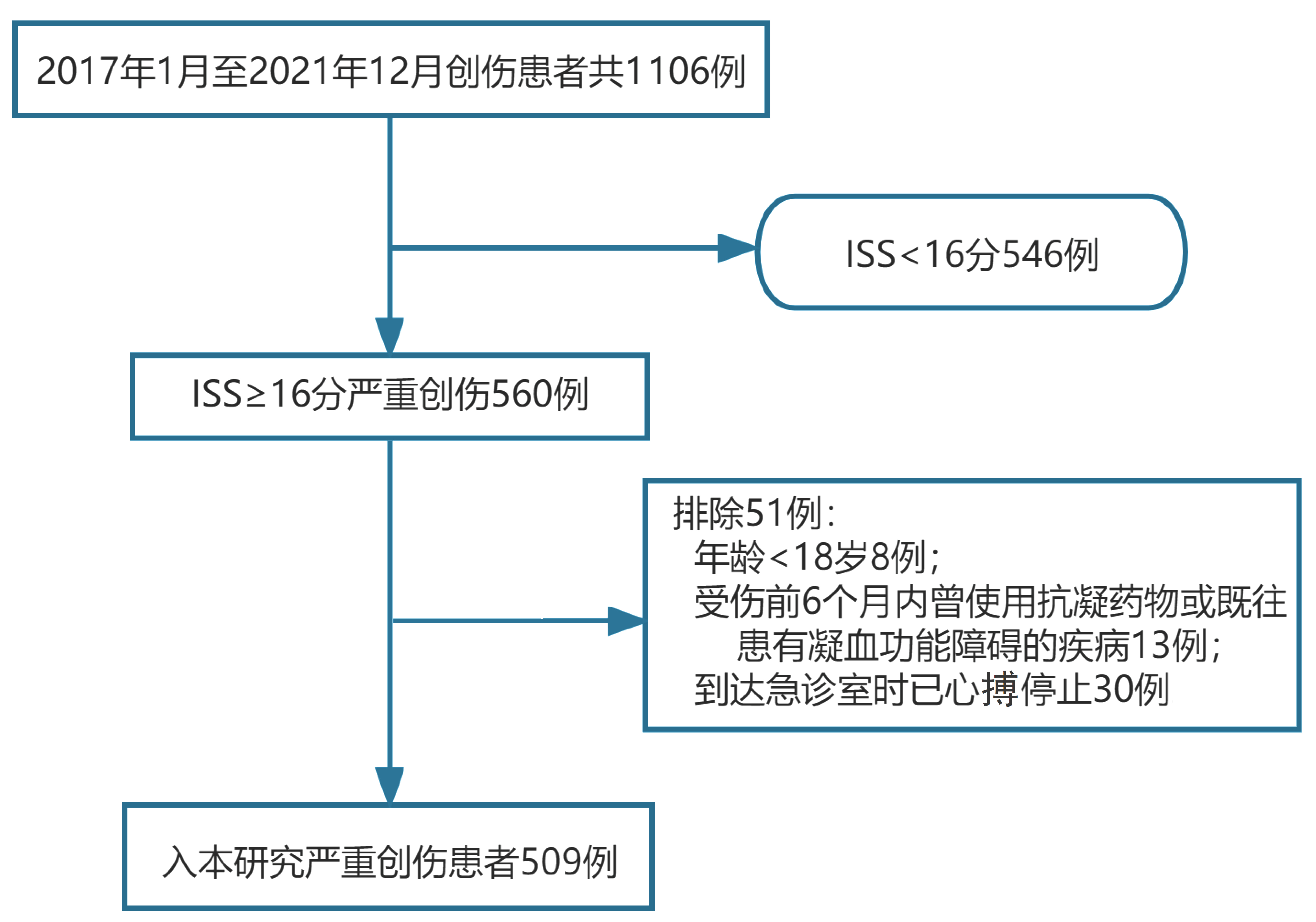 1 资料与方法 1.1 研究对象使用回顾性队列研究方法采集2017年1月至2021年12月苏州大学附属第二医院创伤中心创伤数据库中严重创伤患者[创伤严重程度评分(injury severe score,ISS)≥16分]数据。入选标准:(1) 各种机械原因导致的创伤患者;(2) 年龄≥18岁;(3) ISS≥16分;(4)在急诊抢救室或入院24 h内完成相关实验室检查及初次治疗,或从急诊科直接进入ICU、手术室或其他科室的患者。排除标准:(1) 院外创伤性心脏骤停;(2) 烧伤及化学伤;(3) 合并妊娠;(4) 受伤前6个月内使用抗凝药物或既往有凝血功能障碍的疾病。患者入选流程详见图 1。所有患者根据苏州大学附属第二医院创伤救治标准流程进行创伤初期救治,简要叙述如下:患者到达创伤复苏单元,值班护士立即启动创伤复苏团队,包括急诊外科医生、ICU医生、护理人员,救治人员争取在30 min内完成抢救流程中的初期急救处置,包括建立人工气道,动、静脉置管,液体复苏,保温,采集血标本,超声FAST方案快速创伤评估、外科专科会诊等。经复苏单元初期抢救后生命体征仍不平稳的患者,完成胸部及骨盆床边摄片,所涉及专科与创伤复苏团队讨论后尽快转送手术室、ICU或DSA止血治疗,之后再考虑进行全身增强CT检查;生命体征平稳的患者,先行全身增强CT检查,再根据需要送手术室、DSA或ICU治疗。(见图 2)。本研究经苏州大学附属第二医院伦理委员会审批,伦理审查决定号:JD-HG-2023-08。