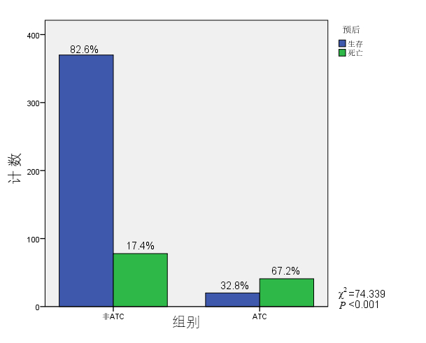 非ATC组28 d病死率为17.4%,ATC组28 d病死率为67.2%,两组比较有统计学差异(P < 0.001)(图 3)。
