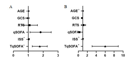 将前述分组比较中差异有统计学意义的年龄、GSC评分、RTS评分、ISS评分、qSOFA评分、TqSOFA评分(P < 0.05)指标纳入二元Logistic回归分析,得出严重创伤患者并发ATC的ISS、TqSOFA优势比分别为1.047和2.054;28 d死亡的年龄、ISS、TqSOFA优势比分别为1.036、1.054、5.529(图 4)。