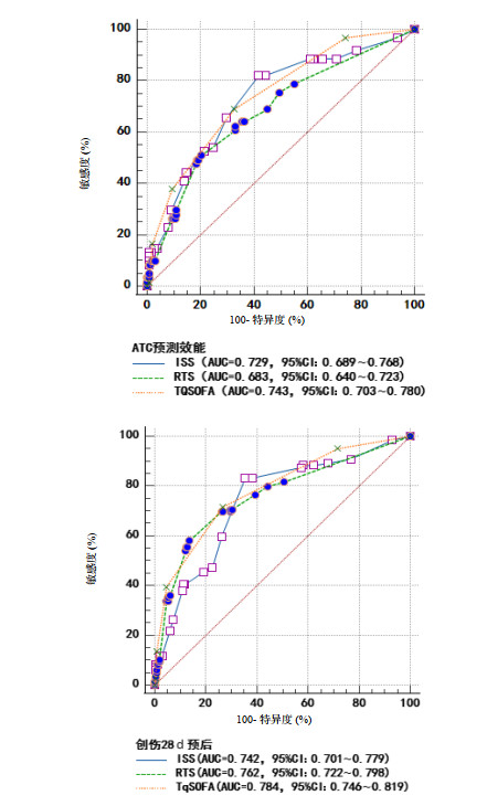 | 图 5 ISS、RTS、TqSOFA对所有严重创伤患者ATC及预后的评估预测价值 |