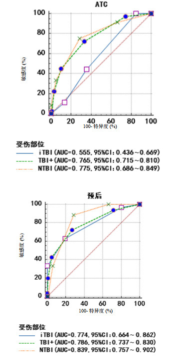 本研究将低体温和qSOFA结合,反映了严重创伤患者入院时一般生命体征状态,可迅速获取,且直接数据化体现其严重程度。TqSOFA评分对于严重创伤患者并发ATC的AUC=0.743和不良预后的评估预测能力AUC=0.784,均高于目前急诊常用的RTS、ISS评分工具,且评分方式内容较ISS更为简洁方便,不受医疗资源所限。本研究还发现,TqSOFA对于不伴有颅脑损伤的严重创伤患者并发ATC及预后的预测效能最佳,优于伴有颅脑损伤和单纯颅脑损伤严重创伤患者。