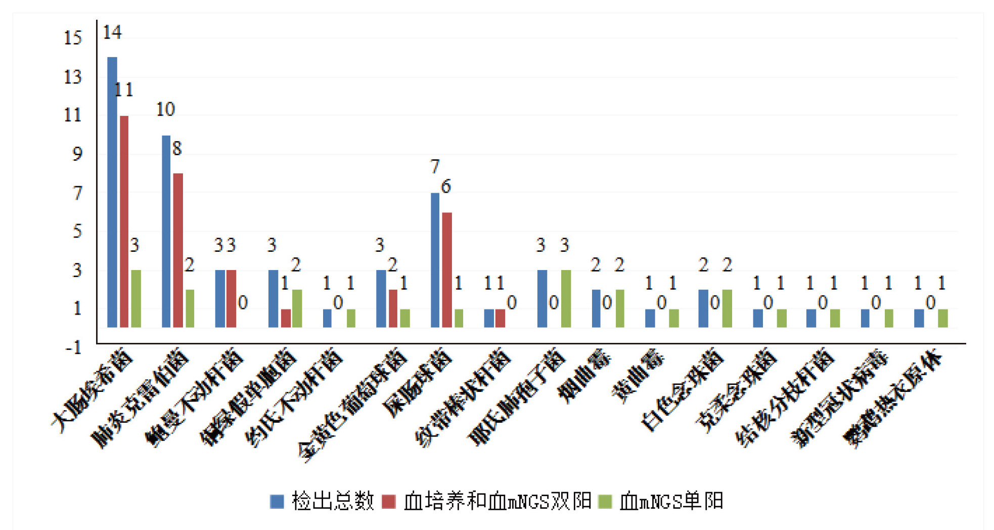 图 1 血培养及mNGS阳性的样本病原学检出情况 Fig 1 Pathogenetic detection of blood cultures and mNGS positive samples |