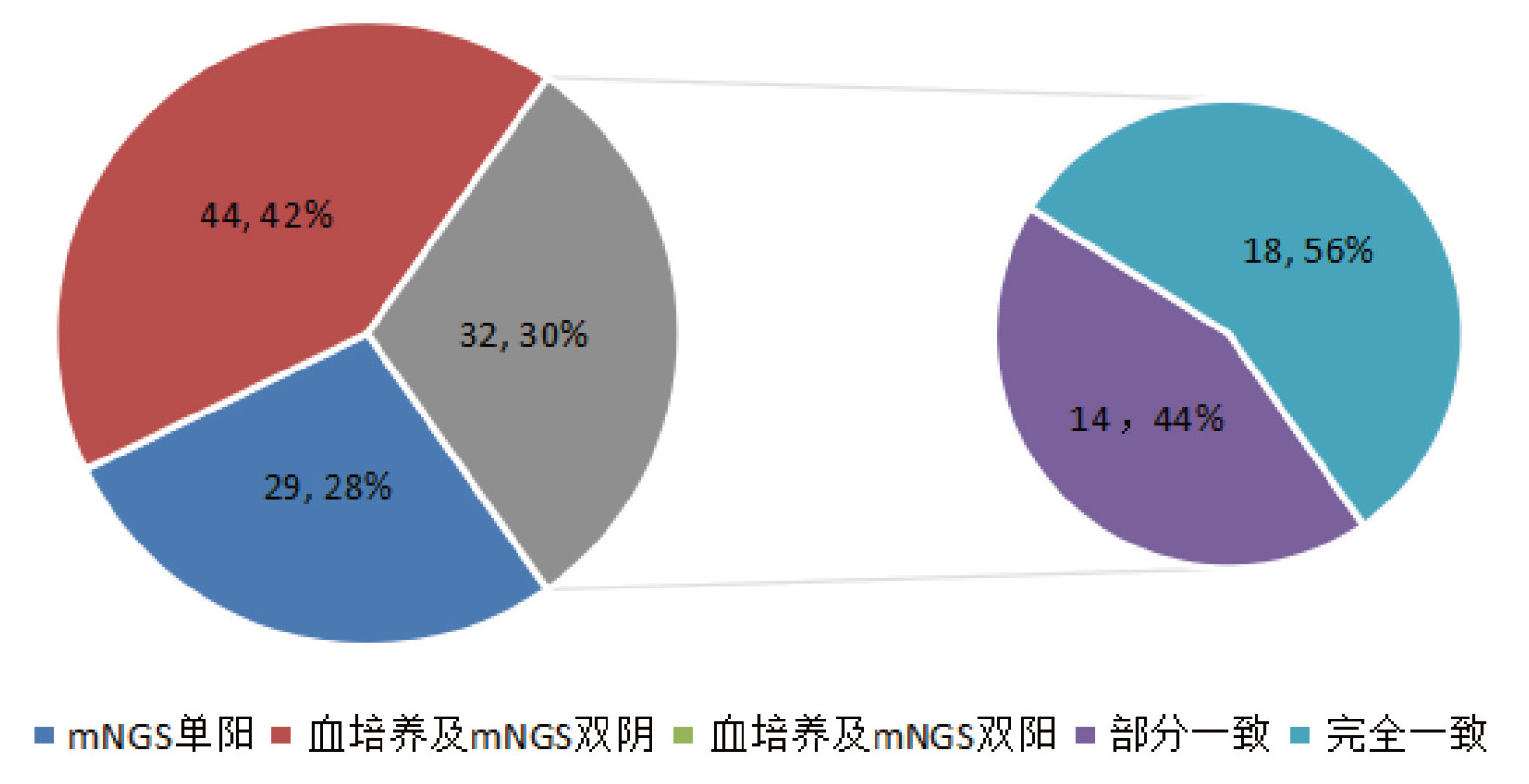 根据血mNGS和血培养结果将入组病例分为mNGS和血培养双阳、mNGS单阳、血培养单阳、mNGS和血培养双阴4类。其中mNGS及血培养双阳的病例有32例(30%),mNGS单阳的病例有29例(28%),mNGS及血培养双阴的病例有44例(42%),无血培养单阳病例。分析mNGS及血培养双阳病例的病原体结果,mNGS和血培养结果完全一致的病例有18例(56%),mNGS和血培养结果部分一致的有14例(44%),见图 2。